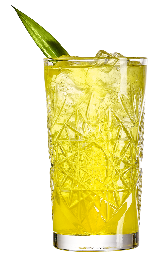 Hæld Råstoff Pineapple-Vanilla over isterninger og fyld op med Sprite eller Faxe Kondi.