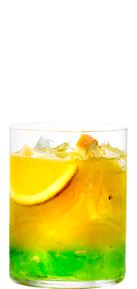4 cl. SMÅ SURE Sour Apple hældes over isterninger. Fyld herefter appelsinvand i og tilføj nogle skiver af appelsin.